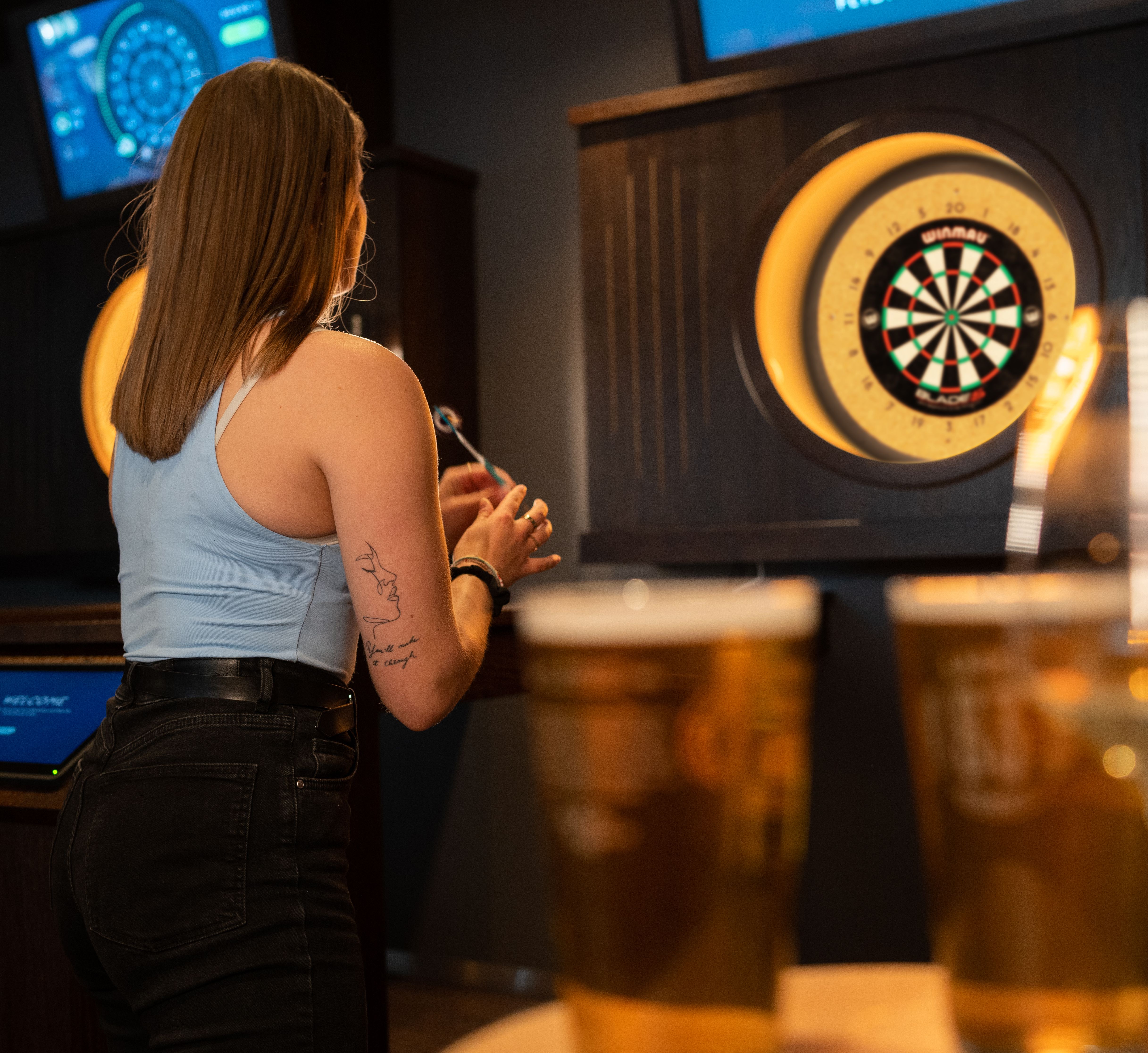 Dzięki interaktywnym tarczom i ekranom punktacja liczy się sama - Wy możecie skupić się tylko na rzucaniu i dobrej zabawie.