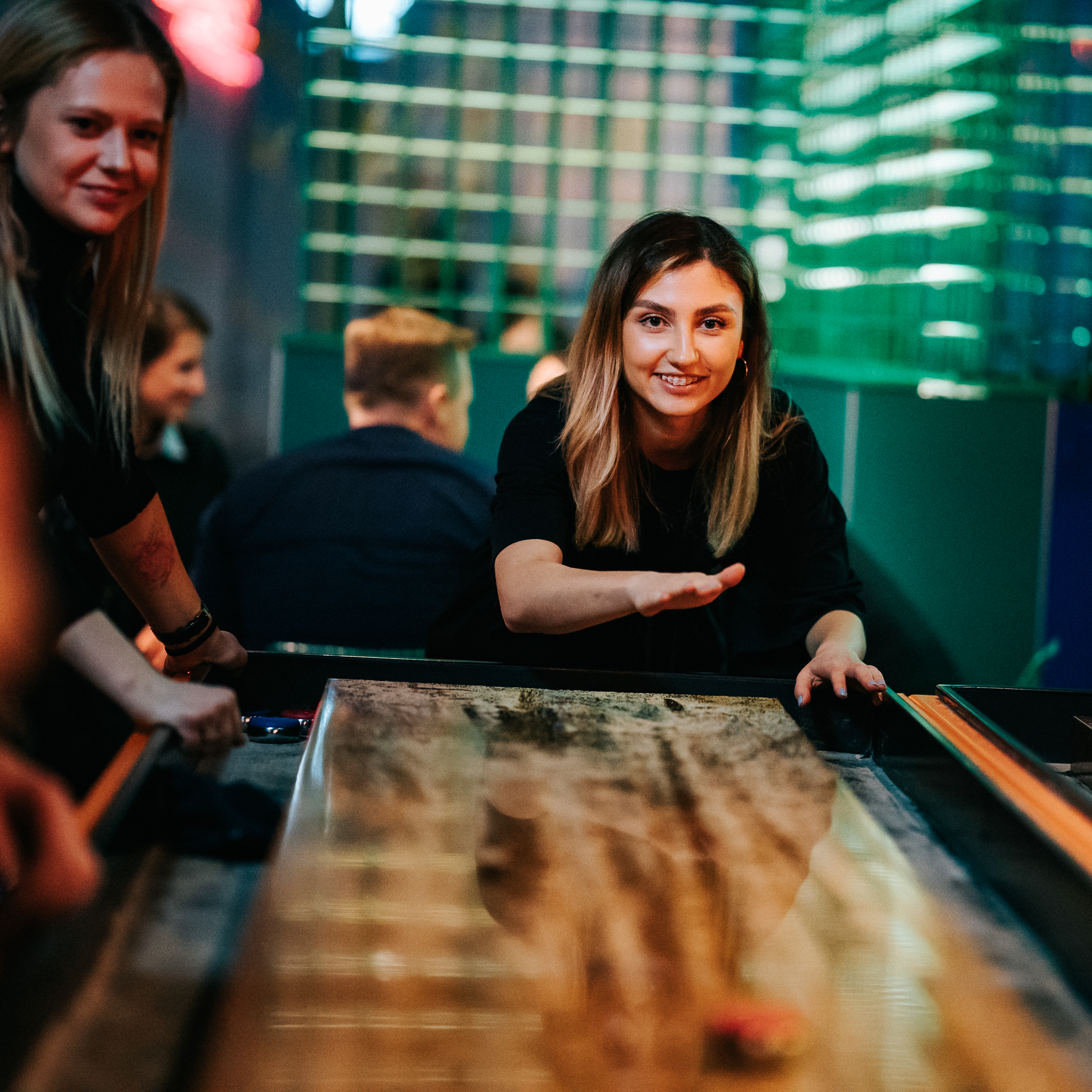 Stołowa wersja podłogowego shuffleboarda. W tej wersji gramy na 6-metrowych, posypanych specjalnym woskiem stołach.